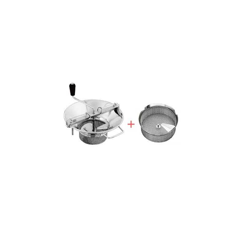 This vegetable mill operates with perforated diameter grids of 1 mm, 1.5 mm, 2 mm, 3 mm, or 4 mm.